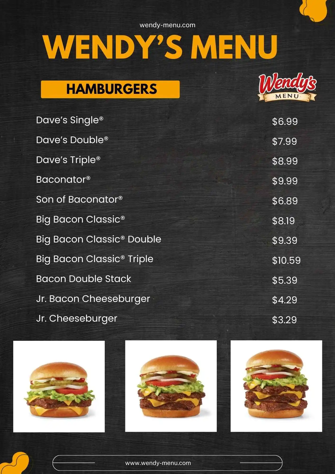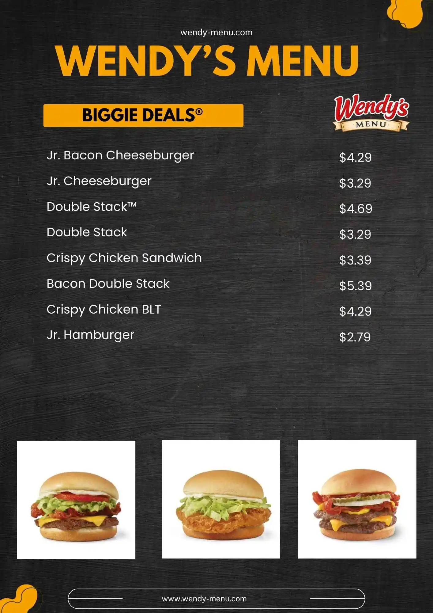 Wendy’s hamburger menu, featuring everything from classic cheeseburgers to the budget-friendly Biggie Bag. Quality ingredients, bold flavors, and always served fresh.